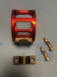 This is a candy-apple red Tiburon Engineering P30 frame for a Penn Special Senator 112H 3/0 fishing reel.