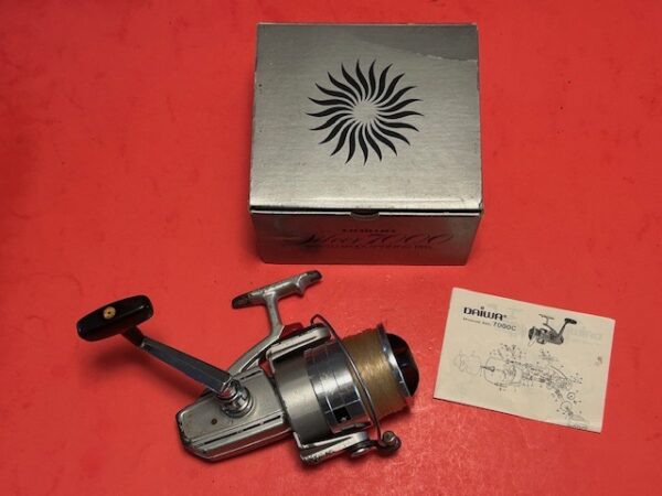 - Vintage Daiwa Silver 7000 skirted spool spinning reel with the original box and the schematic