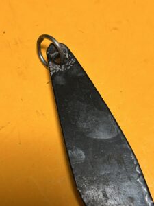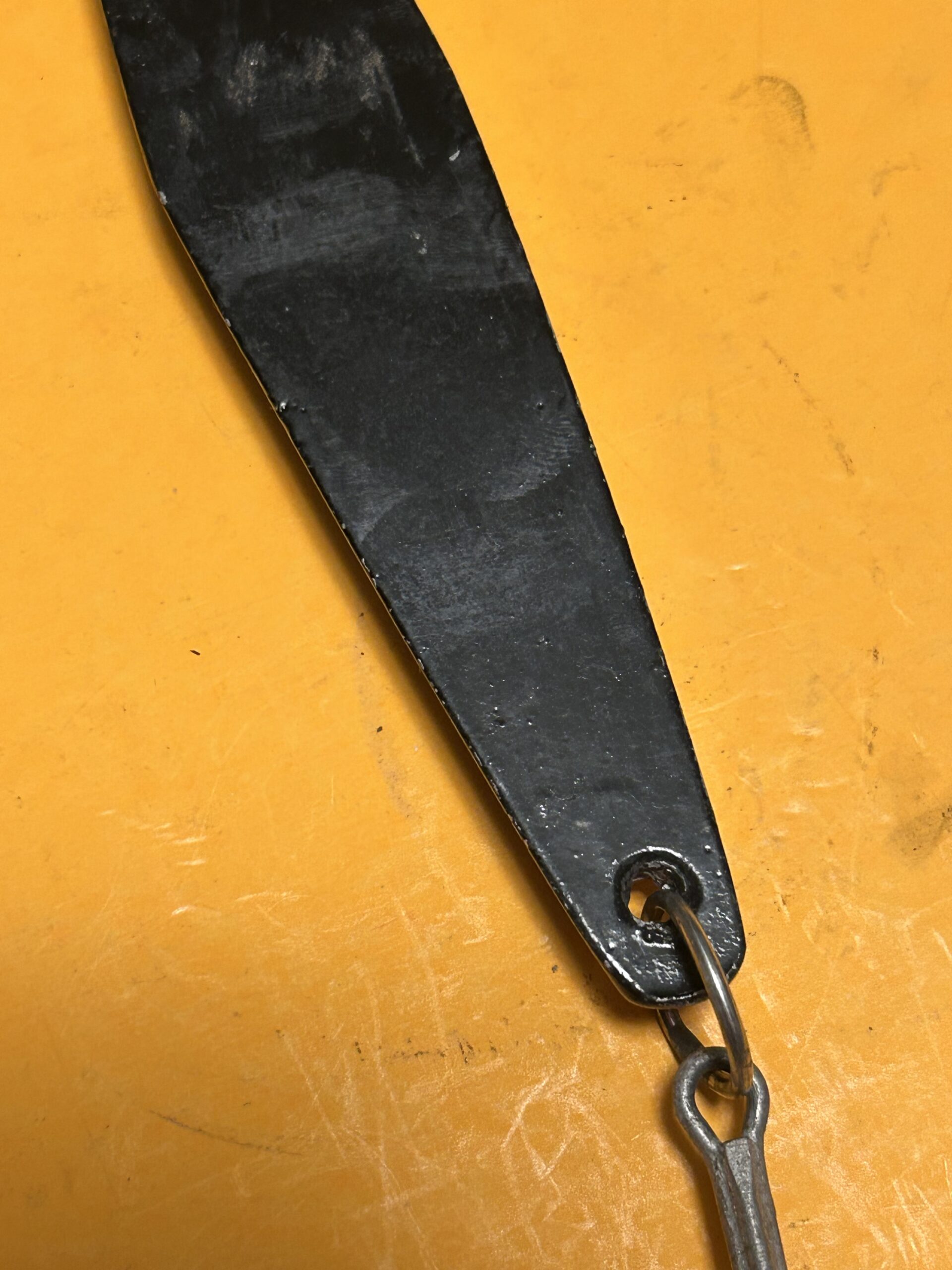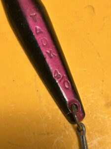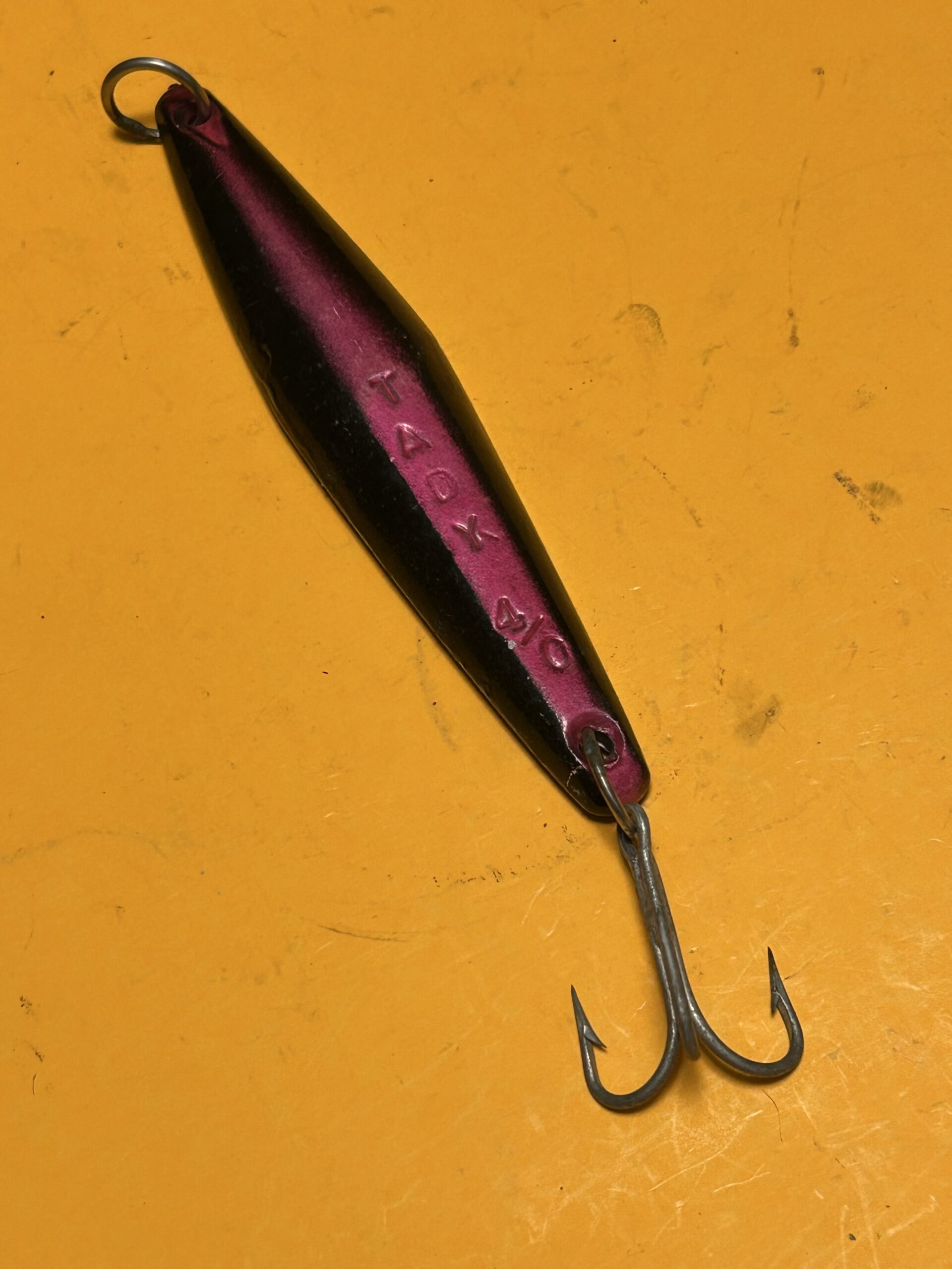 This is an extremely rare Vintage Tady 4/0 Light Surface iron jig with a flat back in a very hard to find purple and black color.