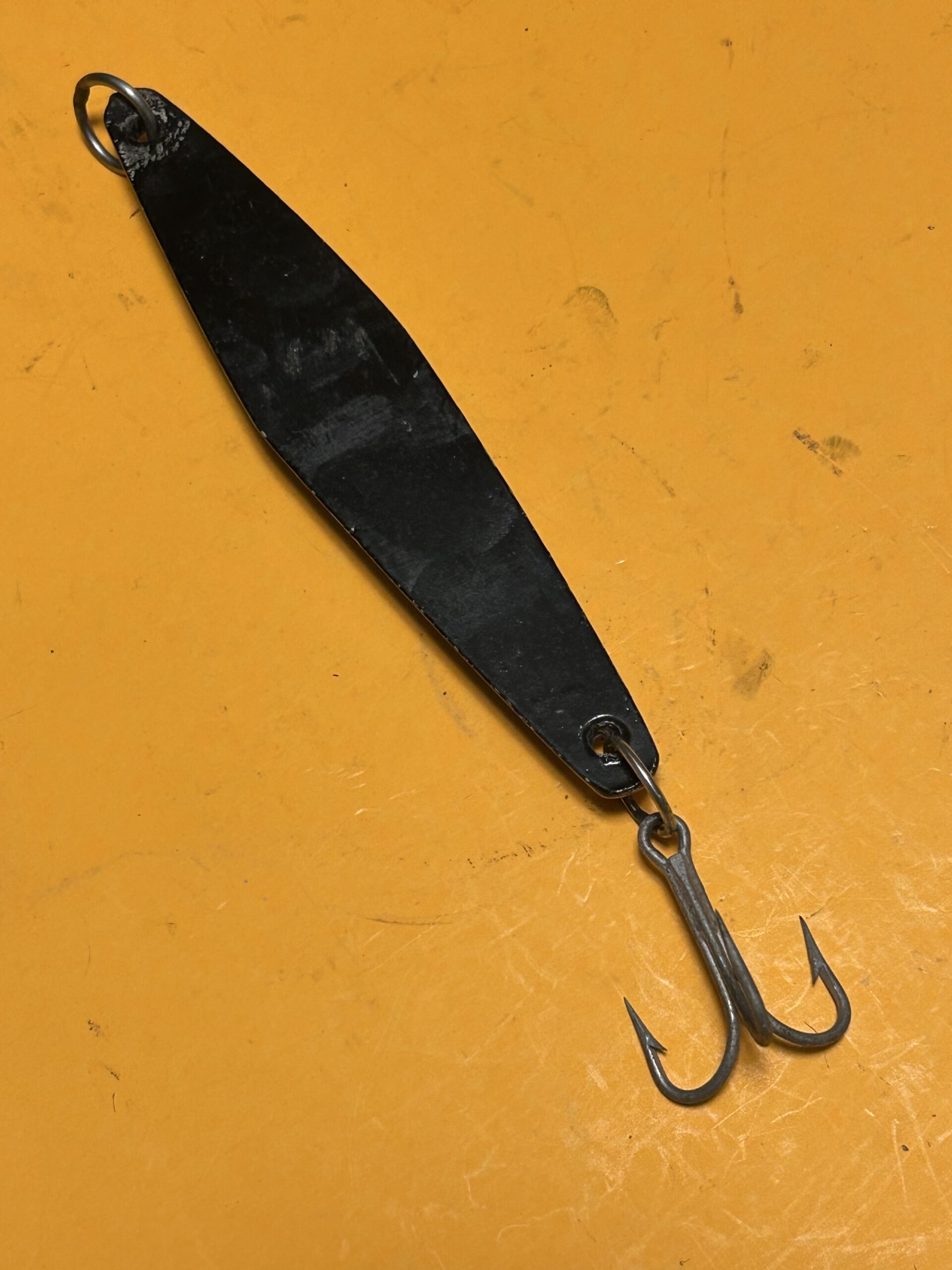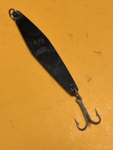 This is a Vintage Very Rare and hard to find Tady 4/0 Light Surface iron jig that is purple and black in color with a flat back. It is 5 3/4 inches long and weighs approximately 2.7 ounces.